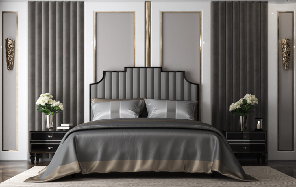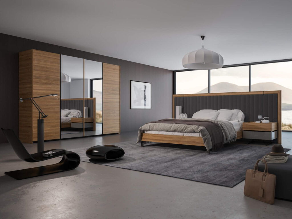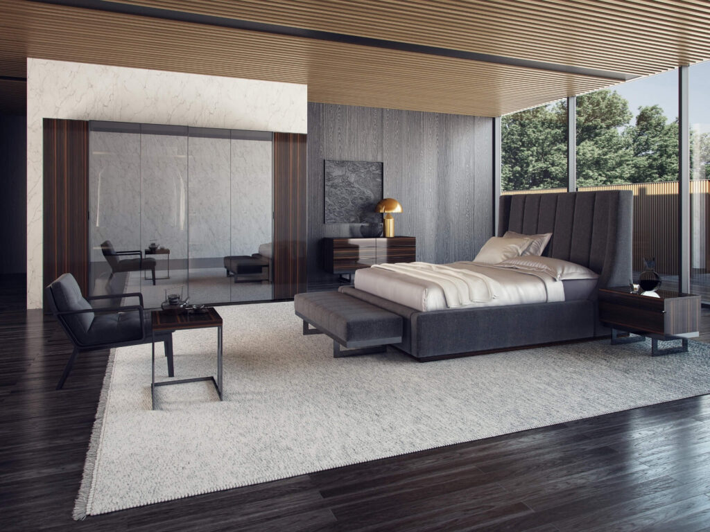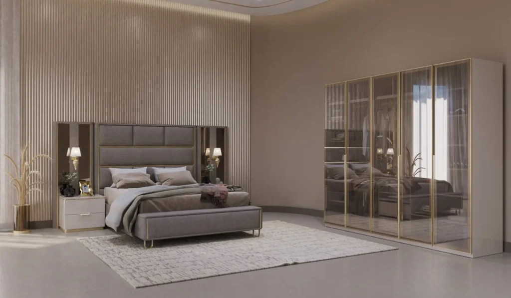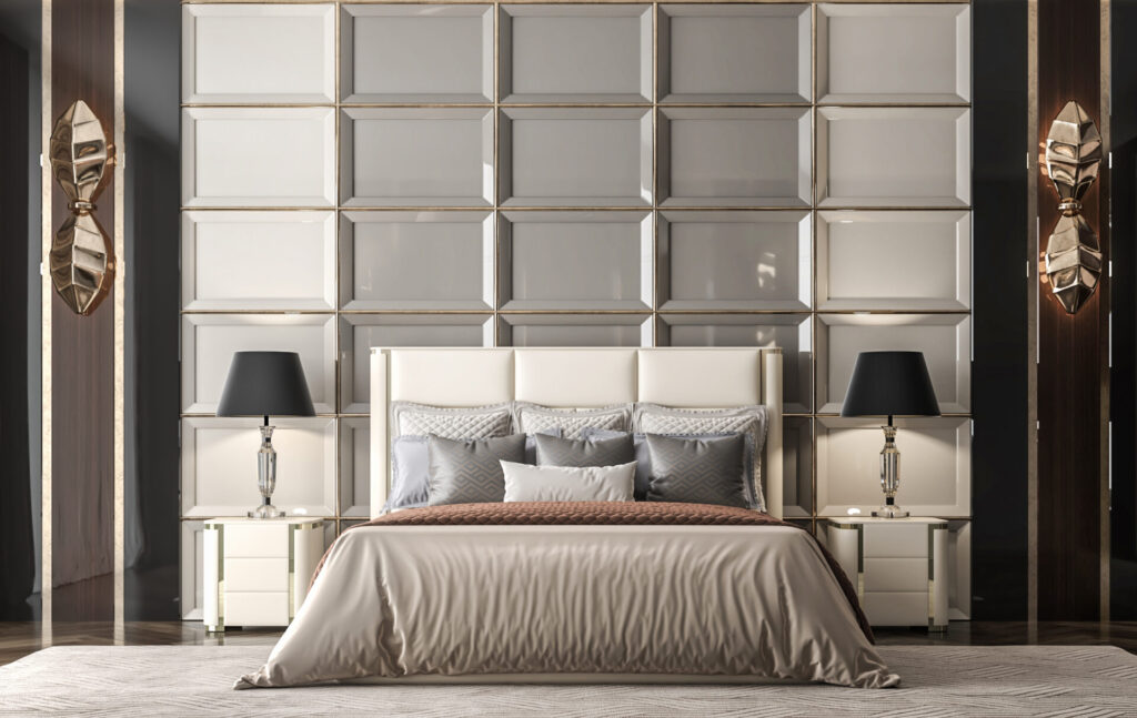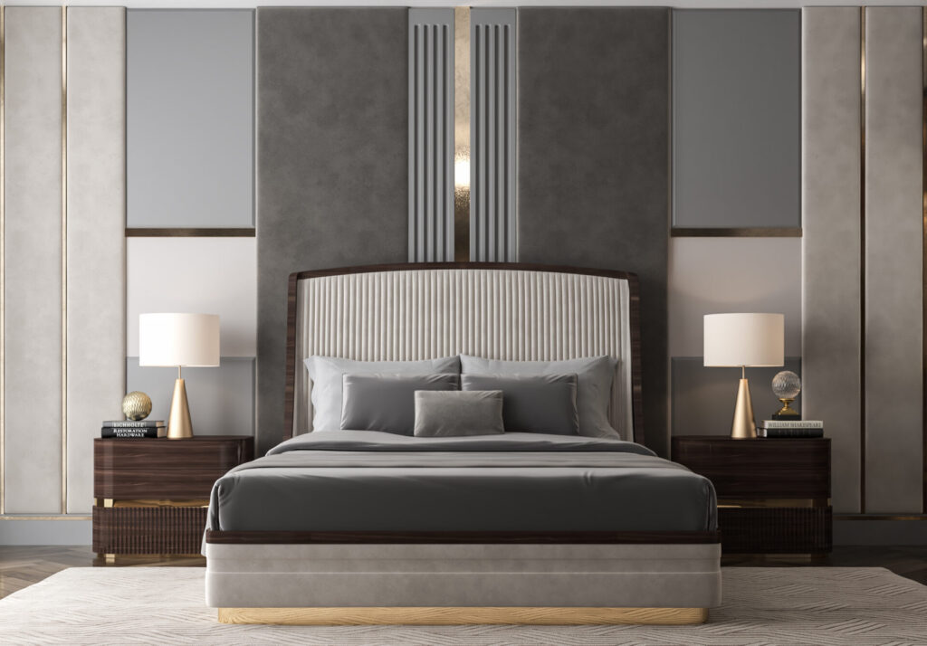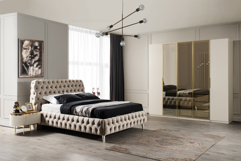 Sumptuous beds in striking volumes, interplays of artfully hung mirrors and elegant wooden shelves combine in the FATHALLAH FURNITURE bedroom to create a stylish, modern haven. Designed to deliver elevated form and functionality, the effect is one of consummate luxury and understated sophistication. TESLA BEDROOM BEIGE Elegant bedroom design with a unique bed and beautiful...